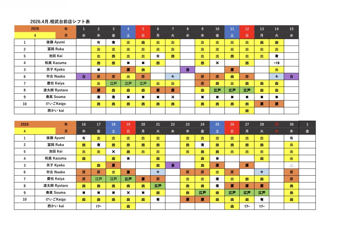 “出” indicates that the staff will be present all day. Numbers represent the time the staff will come to work. For all other cases, the staff is not on duty.